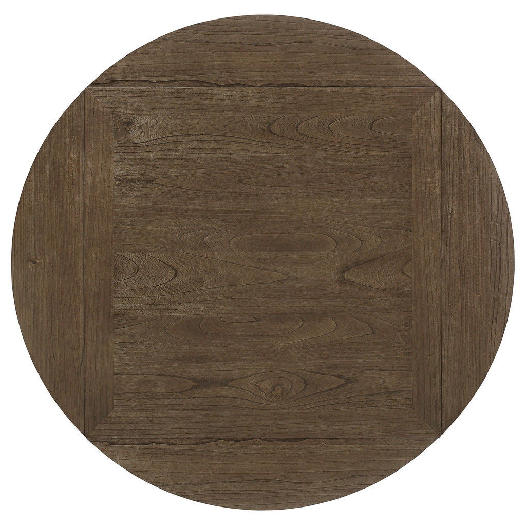 Modern farmhouse style counter height table converts from square to round with four drop leaves, seating up to six