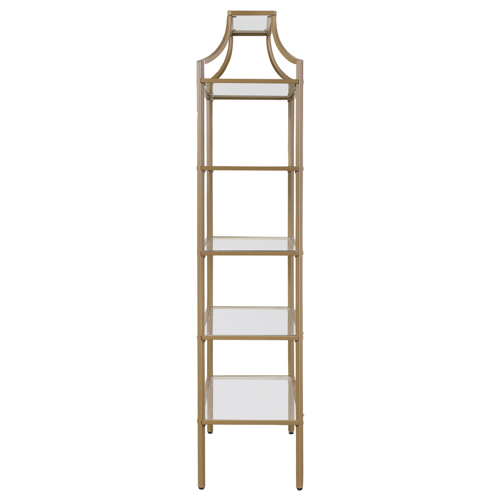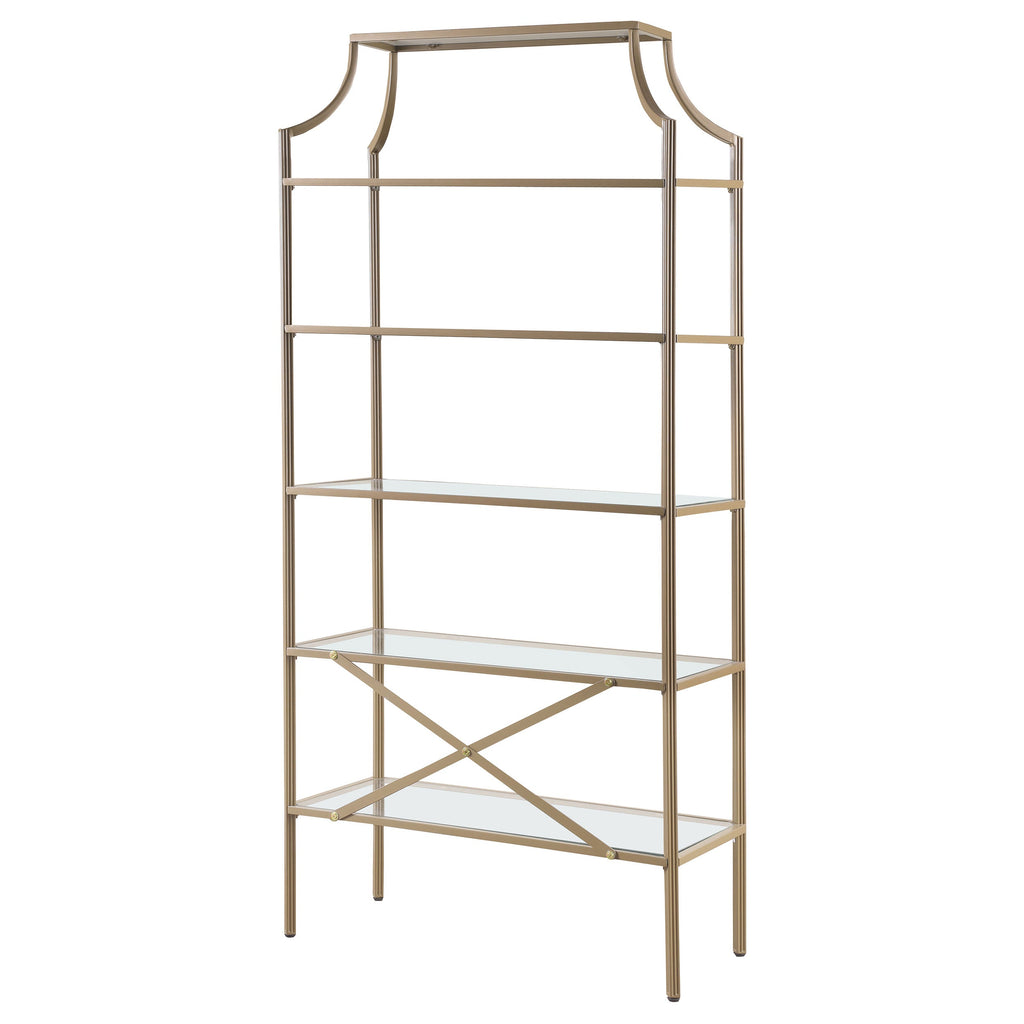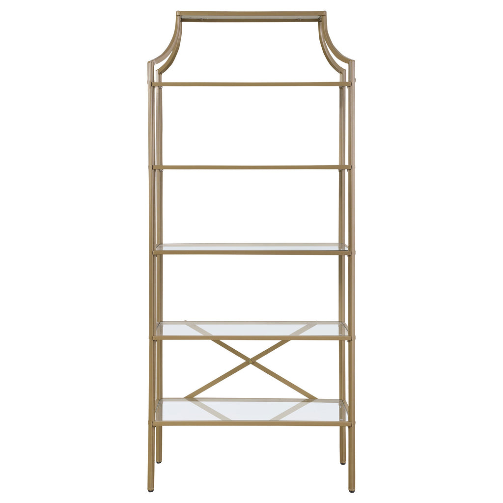 A call for strength and style gets answered by this bookcase. Contemporary style allows for easy placement within your space. The stylish metal frame in gold creates conversation. Enjoy durability as all glass elements are tempered. Updated unit boasts five (5) open shelves for use as storage or display.