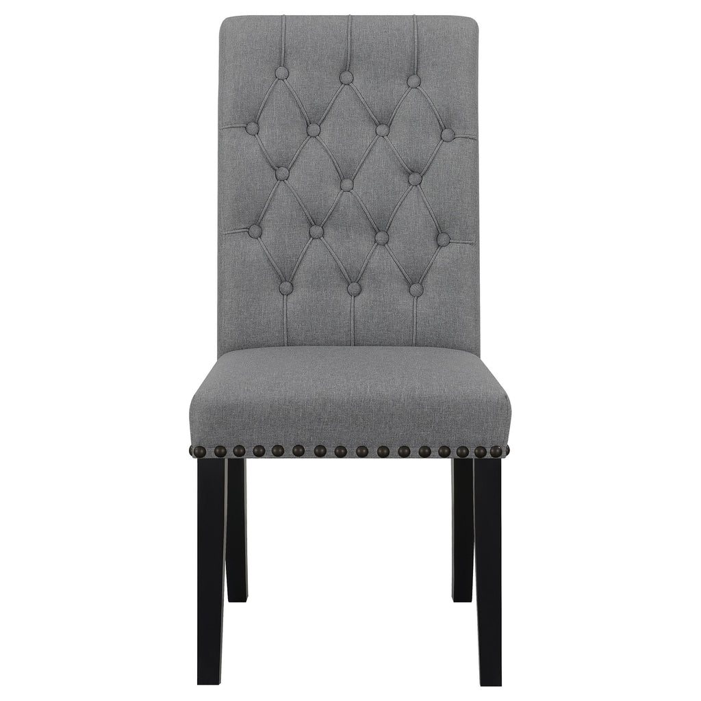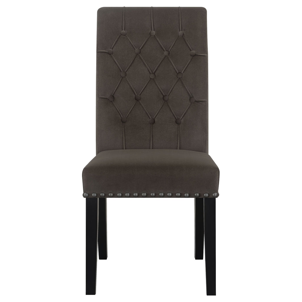 Plushily padded side chairs are adorned with rolled backs and button-tufted upholstery with bold nailhead trim
