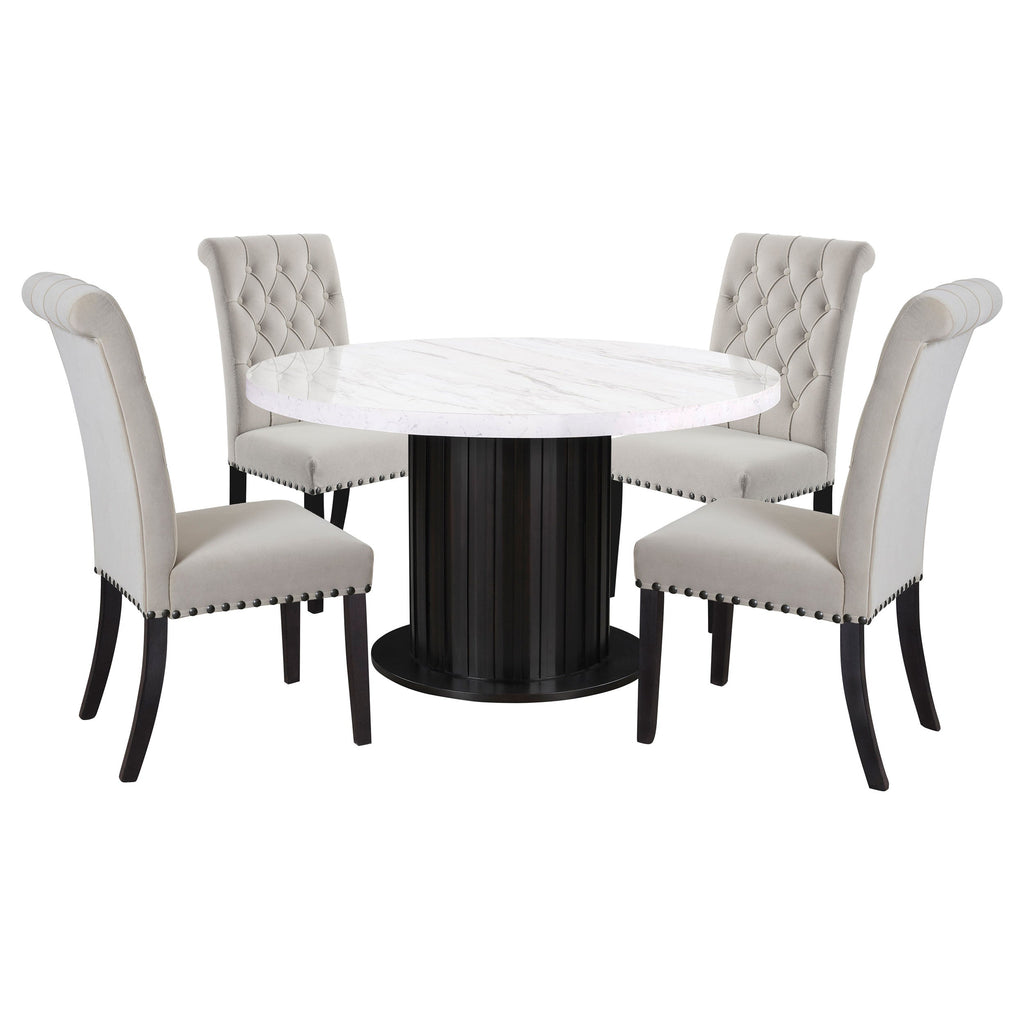Bring together family and friends at this modern rustic style dining table set. The table features a rectangular, thick, white marble top that is spacious enough for six people. Sleek open and airy trestle base with a center punch out, rustic espresso striking color combination lends a dramatic touch and grounds the room elegantly. The set of chairs with a rolled backrest with button-tufted details lends a traditional aesthetic to a space. Also, bringing to your home the classic elements is a padded seat with individual nailhead trim that offers a charming detail.