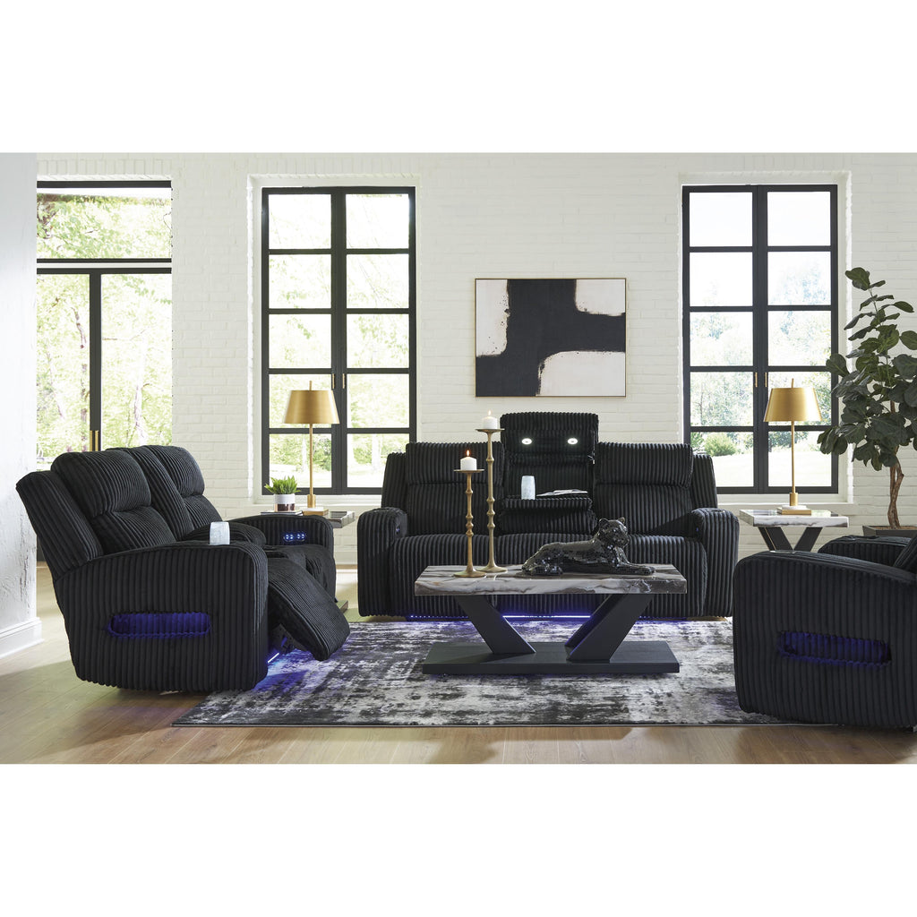 Trend-right style, meet irresistible modern function. Your living room gets a cozy-cool upgrade with this power recliner. Curl up in its ultra-chic corded upholstery and recline with one-touch controls. Is it movie night or game time? With ambient LED lighting, this recliner transforms from a serene relaxation spot to an entertainment hub. USB charging, cup holders and storage cutouts make lounging all the more convenient.
