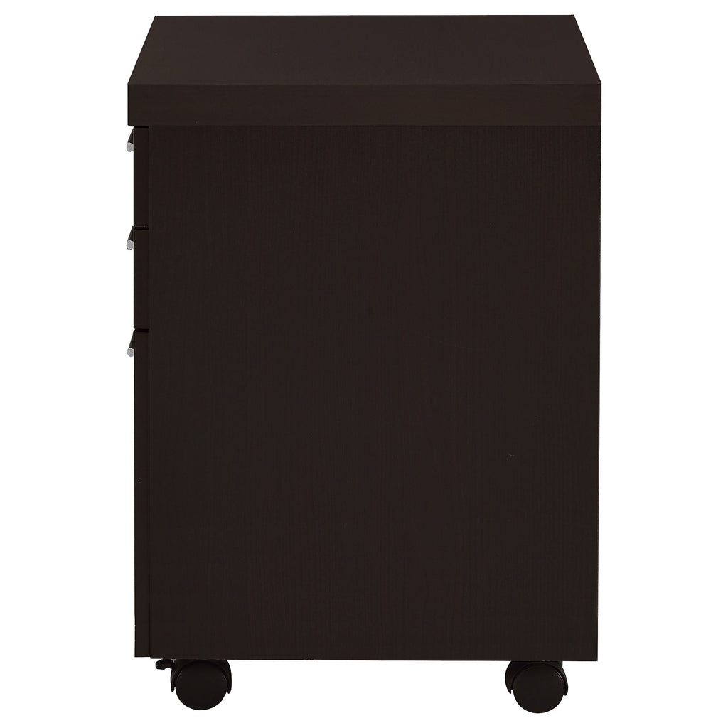 Organize files in style. This mobile file cabinet offers plenty of room to store documents in a desk configuration. With a gorgeous cappuccino finish, it brings a stylish look to a home or business office. Silver hardware pads its modern appeal. Built-in casters and a storage drawer expand the functionality of this mobile file cabinet.