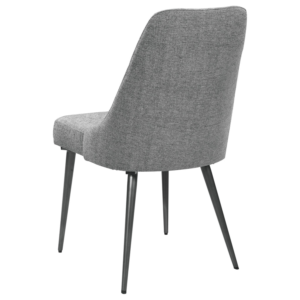 Chairs feature grey textured fabric upholstery and tapered gunmetal legs