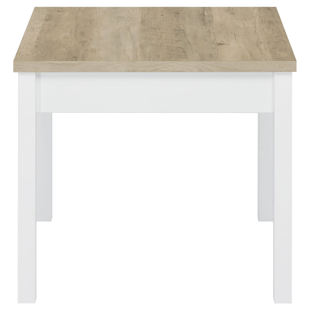An updated version of farmhouse style is soft and easy on the eyes as this three-piece wood coffee table set is a viable option for your family room or living room. Casual and yet nicely designed, this set offers a versatile finish palette of distressed pine and white over wood products. Clean lines add an easy optical effect. Make your space a simple yet stylish venue with tables designed to last through redesigns. Set includes one rectangular coffee table and two end tables.