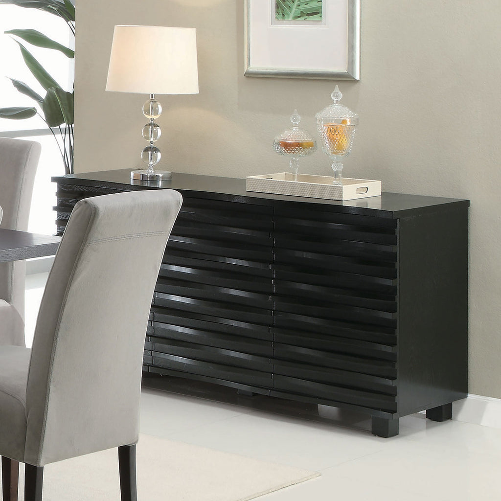 Introduce modern sophistication to your dining or living space with this bold sideboard, crafted from solid hardwood, engineered wood, and oak veneer. Its textured, wave-like front panels and sleek black finish exude contemporary elegance, making it a striking addition to any room. Behind the cabinet doors, you’ll find spacious shelves and three central drawers, providing ample storage for dinnerware, linens, or everyday essentials. The sturdy construction ensures durability, while the rich black finish enhances its artistic appeal. Ideal for those seeking both style and functionality, this sideboard elevates the look of any modern home with its blend of premium materials and thoughtful design.