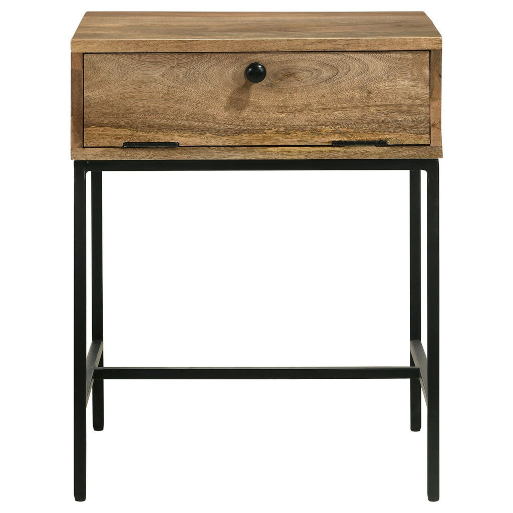 This end table pairs rustic charm with modern functionality. Crafted from solid mango wood in a honey brown finish, it offers a warm, inviting touch to any space. The drop-front door reveals a slim shelf for storing essentials, enhanced by chain accents for added detail. Supported by a sleek iron base with a black finish, the table combines mixed media appeal and sturdy support. A minimalist black knob complements its design, making it a perfect addition beside a sofa or bed.