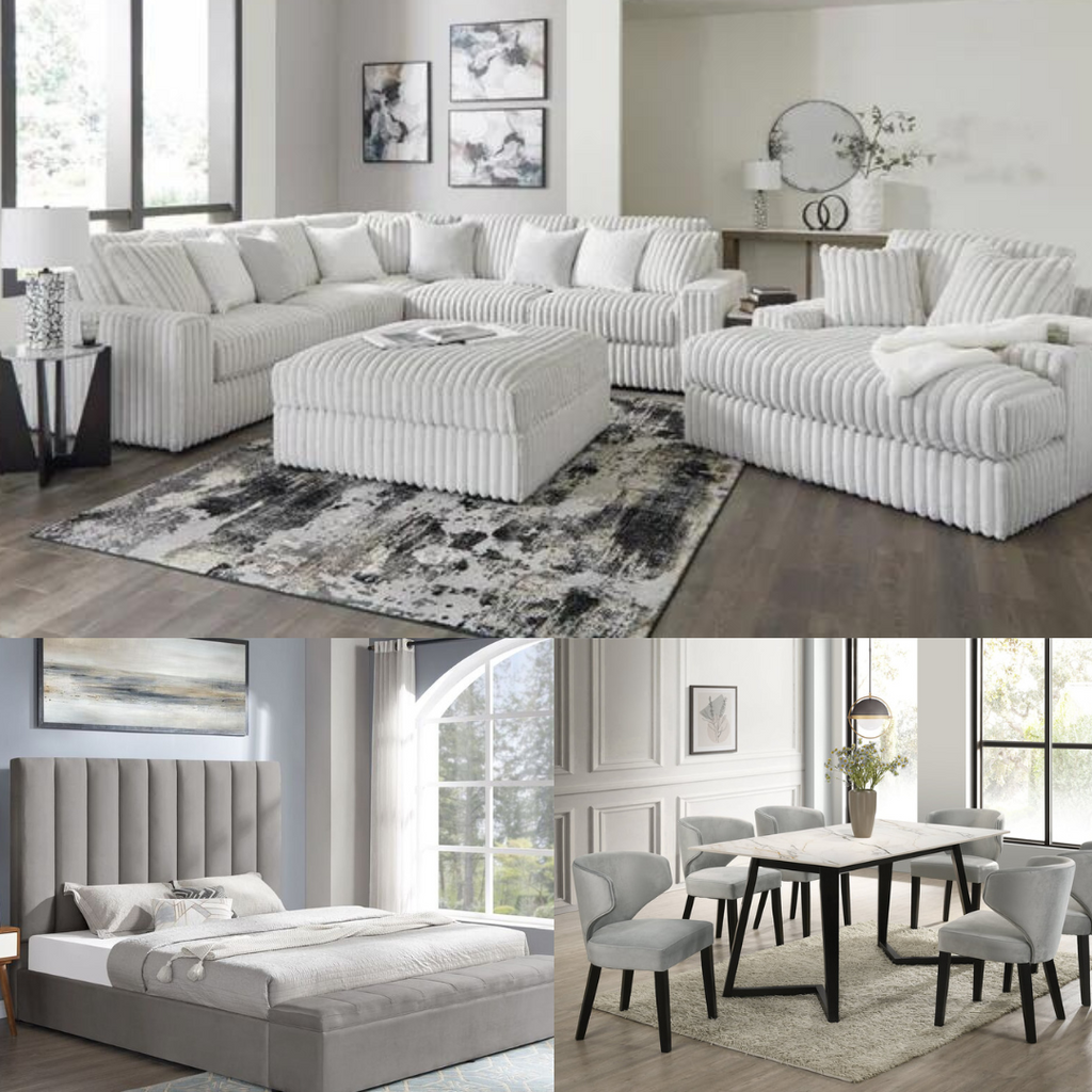 Check out our amazing 3-room package at DMF, featuring a sectional sofa, 7-piece dining room set, and queen-size storage bed. Upgrade to a king size for just $199.99 more. Add a chaise for $1099.99 and an ottoman for $499.99 to complete your perfect living space.