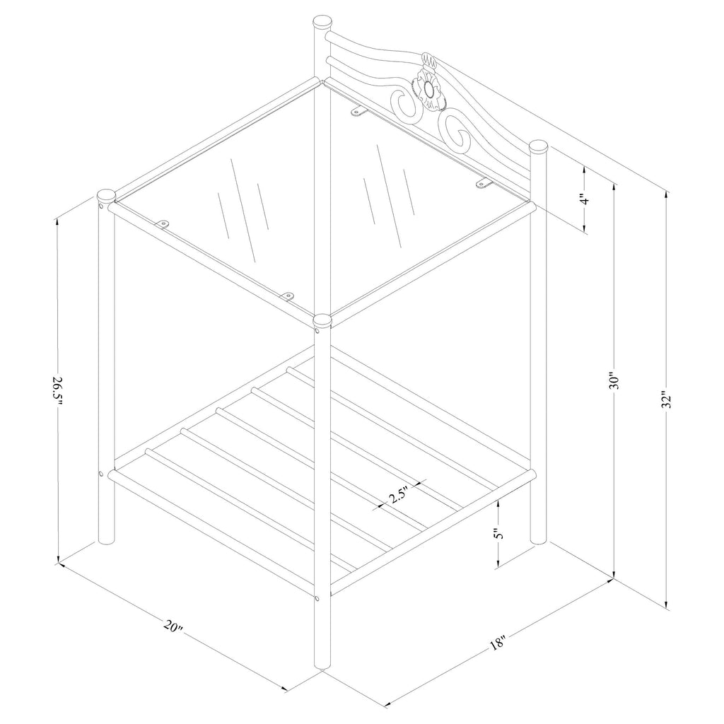 A charming blend of function and vintage style, this nightstand enhances any bedroom with its antique brushed gold frame and airy, open design. The clear tempered glass top adds a crisp, lightweight feel, while a slatted lower shelf offers convenient storage. With its decorative metalwork and practical layout, this accent table doubles as a side table or occasional table, making it a versatile addition to both bedroom and living room settings.