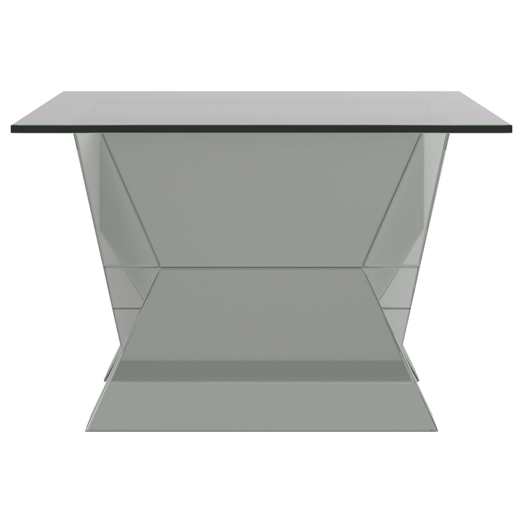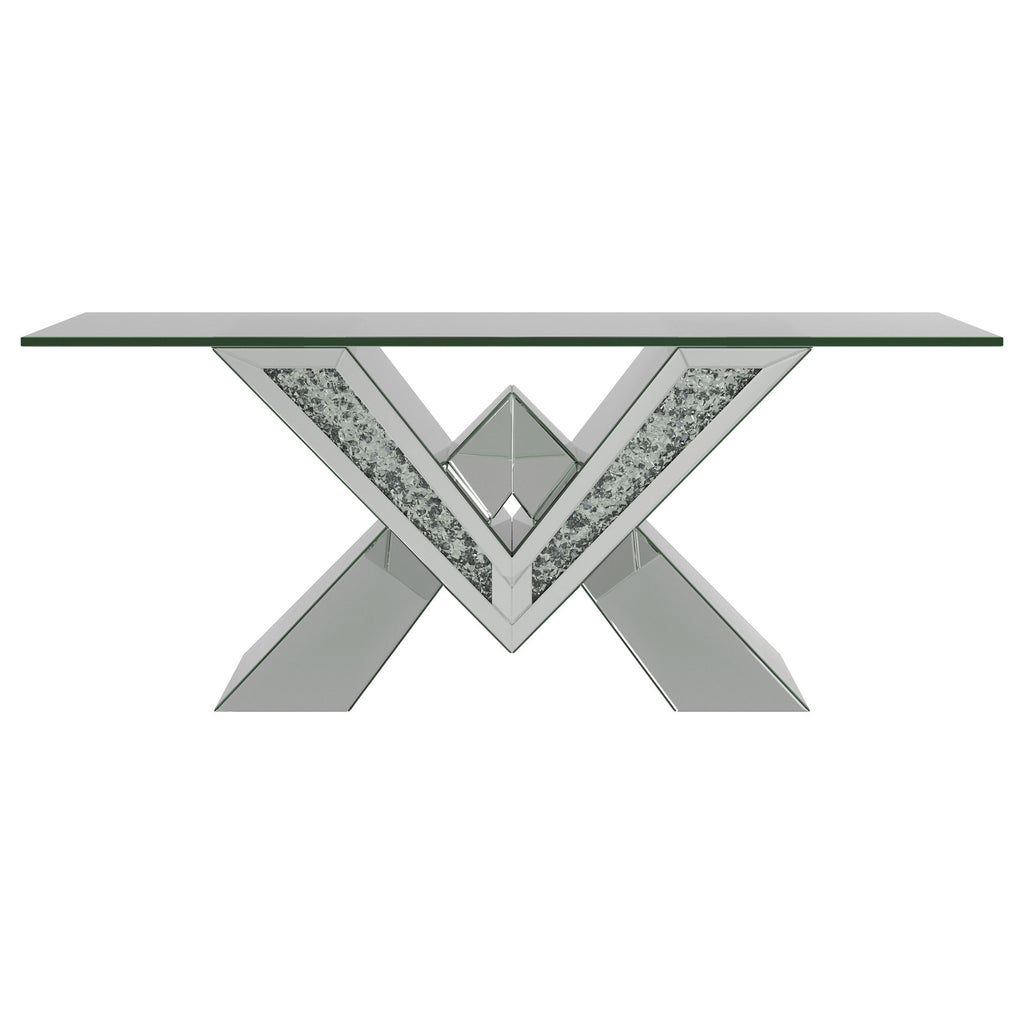 This mirrored coffee table serves as a stunning centerpiece with its bold design. The V-shaped base showcases mirrored panels and sparkling crystal accents for an opulent look. The rectangular, beveled tempered glass top adds elegance and practicality, making this table ideal for entertaining or displaying decor. A striking blend of luxury and modern aesthetics, it elevates any living space.