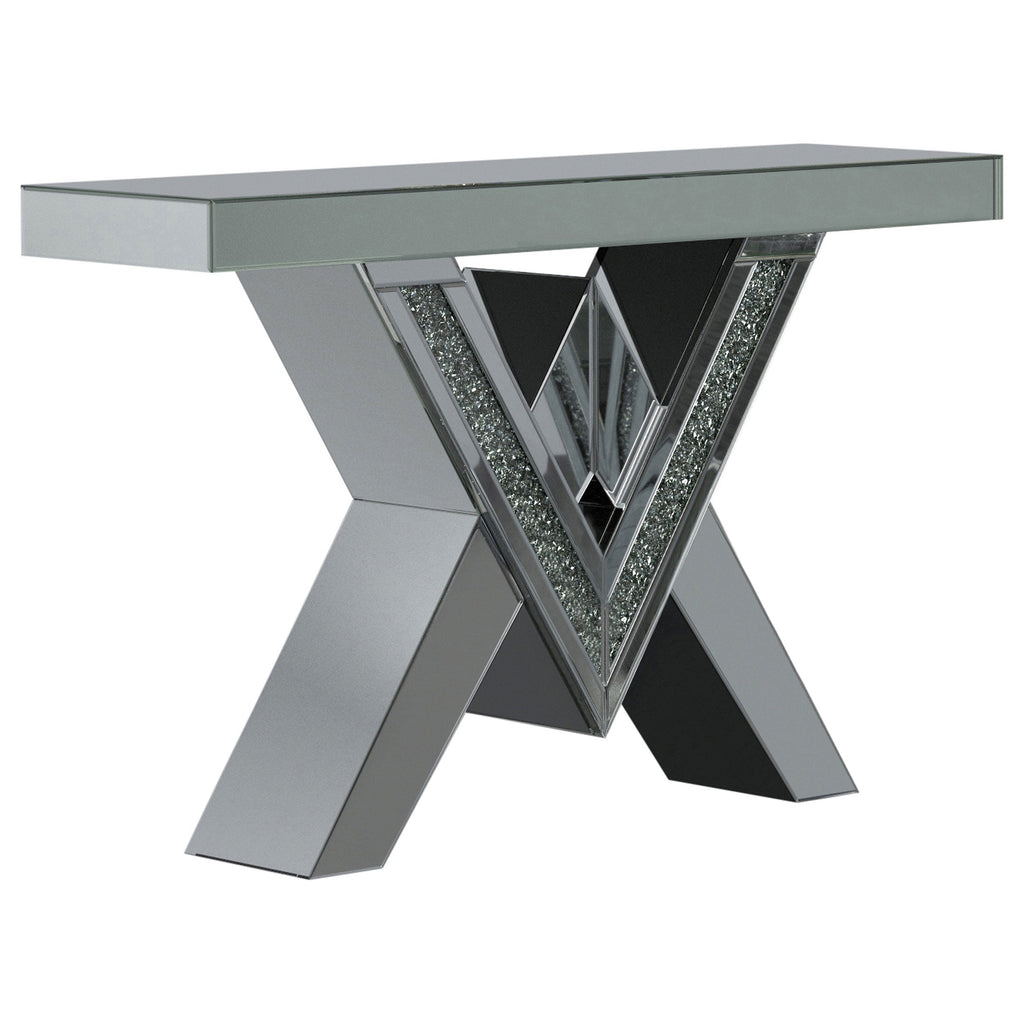 This mirrored console table boasts a striking V-shaped base with angular design elements, featuring inlays of sparkling acrylic crystals. The geometric form is complemented by sleek mirrored surfaces that enhance its modern aesthetic. The design combines bold angles with refined accents, making it a statement piece for any contemporary space. Crafted with durability in mind, this console table offers both an elegant appearance and functional design.