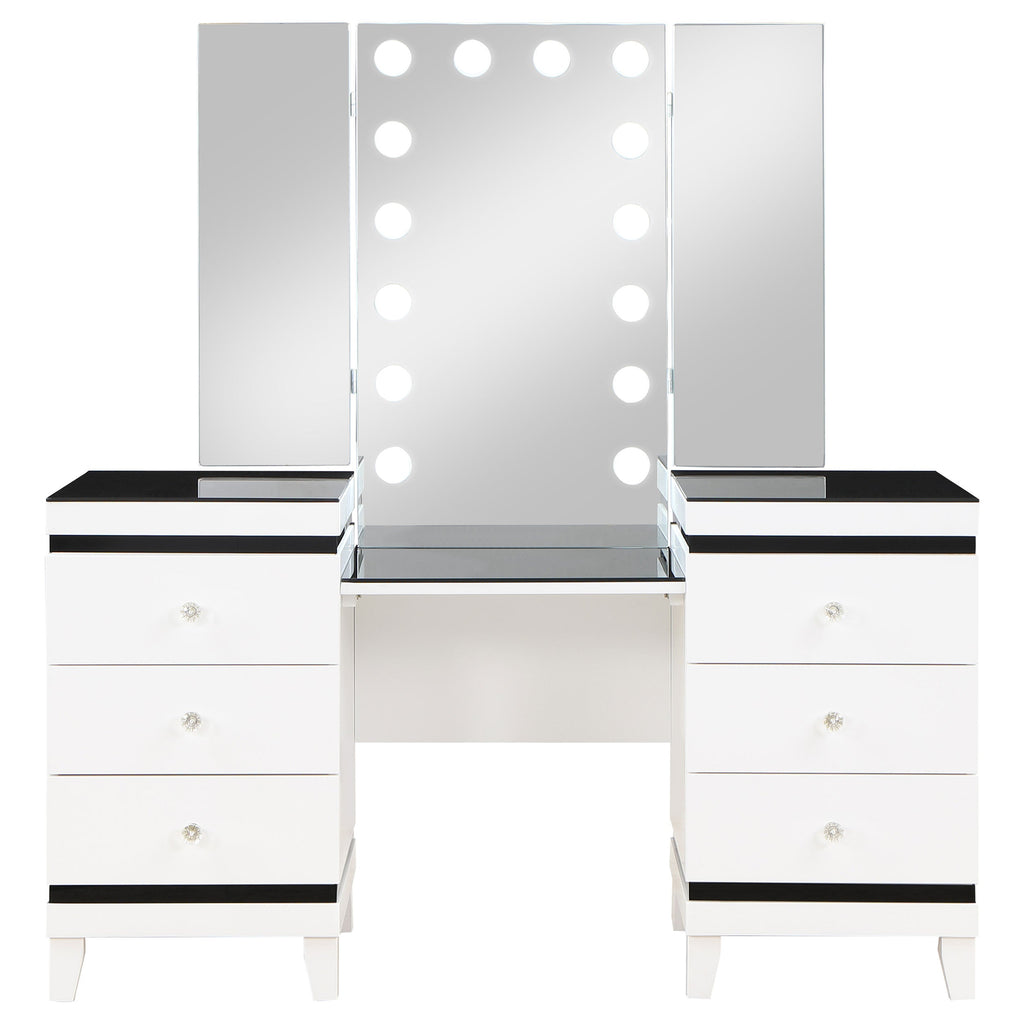 Take modern glam to new heights with the bold contrast and sophistication of this contemporary vanity desk. With six roomy drawers for easy storage, including a felt-lined top drawer for delicates, the large desk features a bold black and white finish sure to stand out within your bedroom or dressing area. A tri-panel mirror equipped with 14 lights, delivering the bright illumination you need for applying makeup and styling hair. The clean-lined design is complemented with crystal-like knobs that glimmer in the light, and tapered legs that offer excellent support and stability. The vanity is complete with full extension metal glides for seamless performance as you prep for everything from a day in the office to a night out on the town.