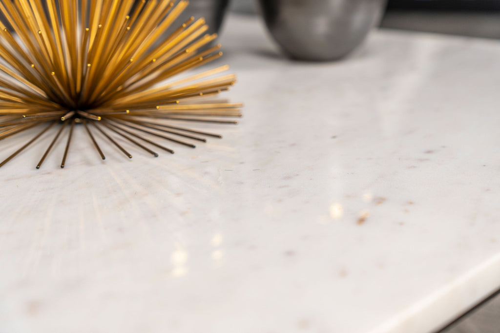 An attractive square shape begins the design path of a glam-inspired coffee table toned down with a hint of industrial style. Turn a casual or semi-formal living room or family room into a gallery of architectural and artisan design. Start with a coffee table featuring a bold black finish metal frame in a crisscross shape. A chic marble top offers a blend of white tones and gray touches, versatile and decadent. This cocktail table features straight edges and a dissected-angle design adding optical energy.