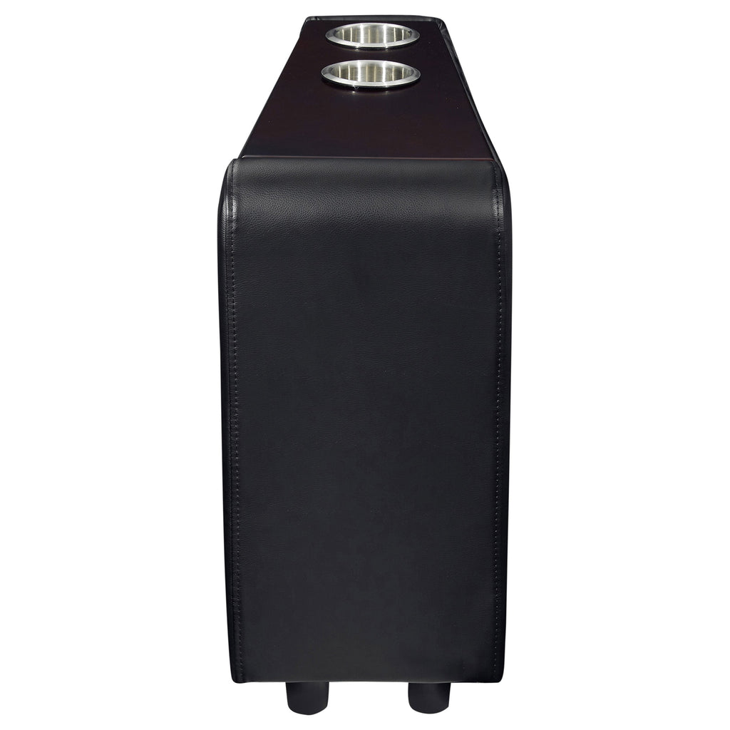 Unite a pair of theater-style recliners with this useful seating console. This think addition rests between two recliners. It offers two cupholders, perfect for a relaxing with a movie or binge-watching a new favorite. Black faux leather lends a rich look and feel. Create the ultimate home theater experience.
