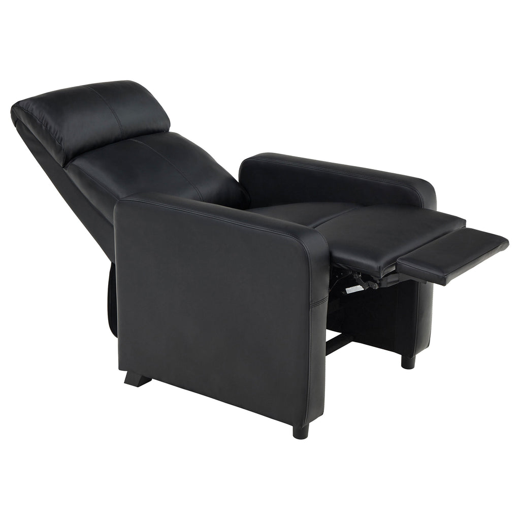 Modern home theater seats are bound to bring the movie experience to your home. Choose your custom configuration of black home theater seats, upholstered in leatherette. Slim track armrests give the chairs stylish appeal along with tufted backrests. Consider the optional consoles to go between each seat and serve as a cup holder. Choose this home theater recliner set to elevate your next home theater adventure.