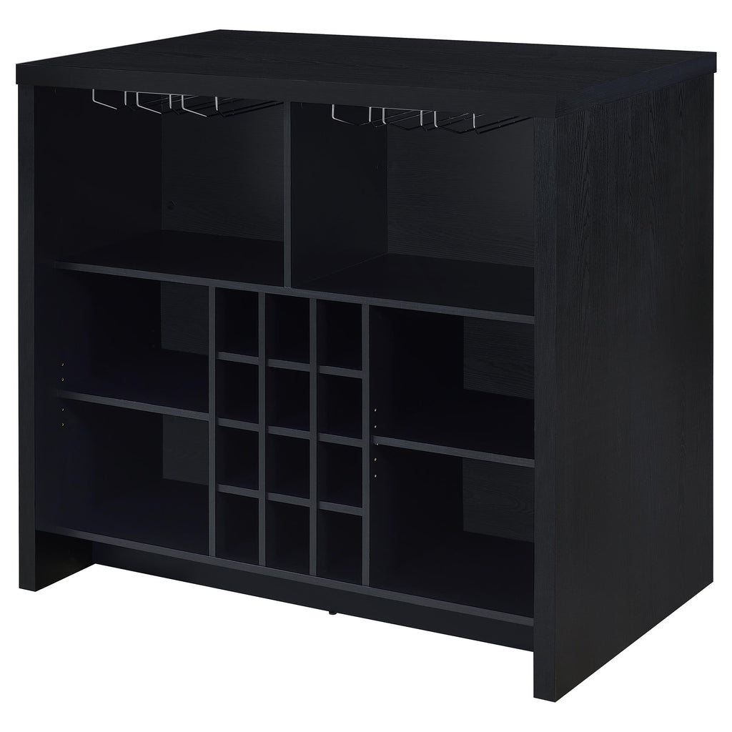 This home bar combines modern style with functionality, crafted from engineered wood and laminate veneer for a sleek, durable design. Perfect for entertaining, it features a wine bottle grid that holds up to 12 bottles, multiple open shelves for organization, and integrated metal stemware racks for hanging glasses securely. With its versatile storage solutions and sturdy construction, this bar is an ideal addition to any home, keeping your entertaining essentials stylishly organized and accessible.
