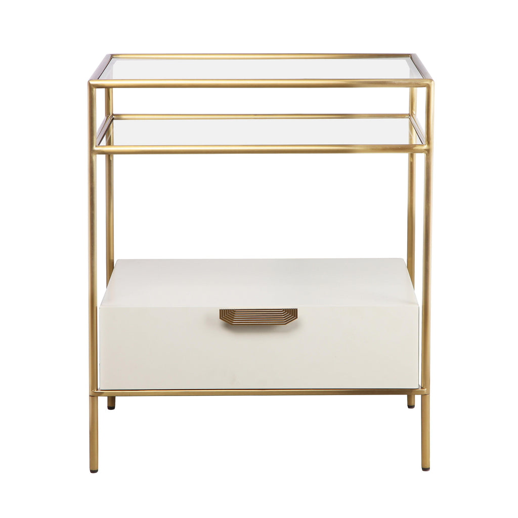 Add some understated drama to your bedroom with the Darla Cream Glass Nightstand, designed for effortless assembly without compromising on style. Its beautiful silhouette is accentuated by a brushed brass frame that glistens subtly beside any bed. With a glass top and shelf, along with a statement drawer pull, this nightstand seamlessly combines form and function to elevate your bedroom decor.