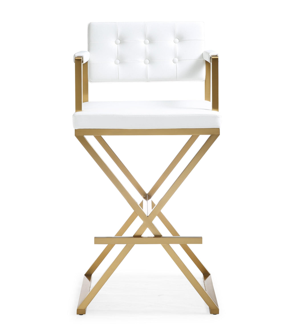 Furnish your kitchen or bar area in contemporary style with the Director stool. The gold solid stainless steel frame provides a sturdy base, while the plush extra deep seat and footrest ensure maximum comfort. The combination of angles and gentle curves gives this stool an eye-catching appearance, while the neutral color allows it to match well with any decor.