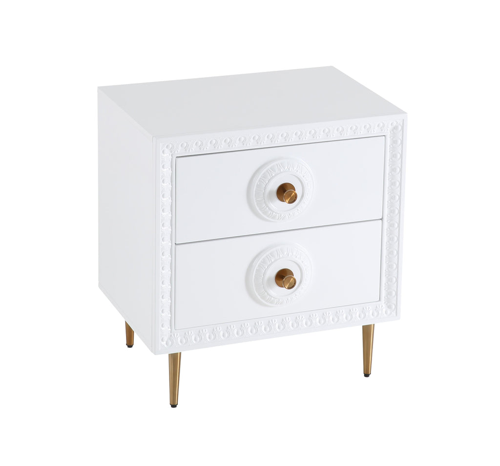 Add an element of fabulously glam fashion with the Bovey side table. Featuring a lacquer finish with intricate molding, gold hardware and tons of storage space, it's available in two colors to suit your fashionable taste.