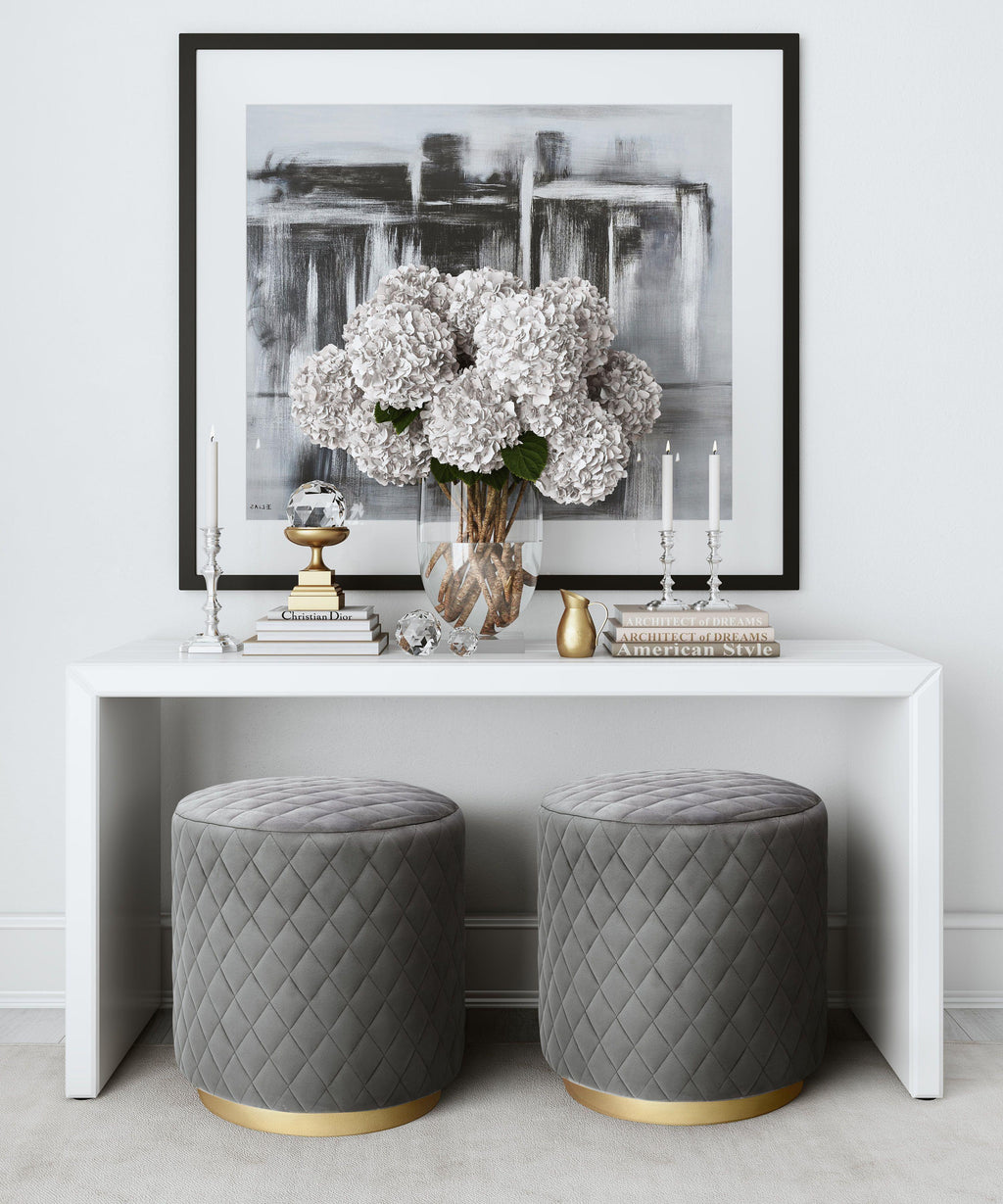 The Abir features elegant diamond tufting in sumptuous grey or light blue velvet and sits atop a glam brushed gold base. Place the Abir anywhere for that finishing touch and use it as an ottoman or as a stool that provides that extra seat.