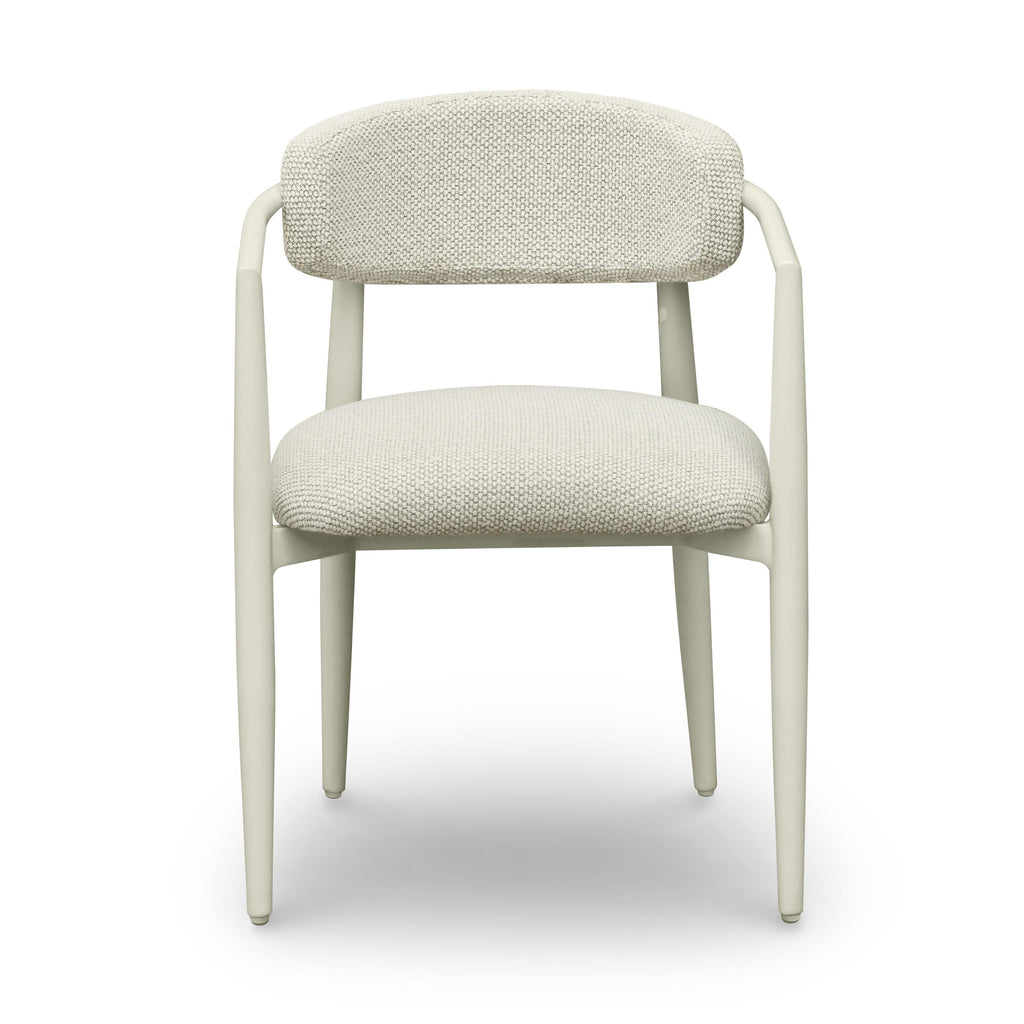 Elevate your outdoor dining experience with the Annika Textured Outdoor Dining Chair, a perfect harmony of comfort and style. Available as a side chair or armchair and offered in a black or cream outdoor-safe textured upholstery, this chair effortlessly blends sophistication with durability. Its rust-resistant aluminum frame ensures lasting strength, while the plush design invites you to linger longer, creating moments that turn meals into memories.