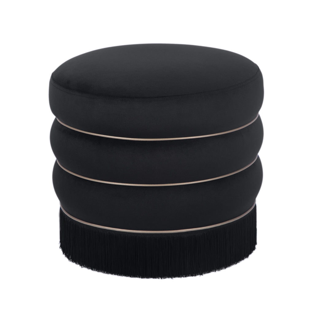 Retro meets modern with the Lakka ottoman. This intricately designed ottoman features luxurious velvet upholstery and vegan leather piping while its tasseled base completes the look. Available in multiple colors to suit your decor