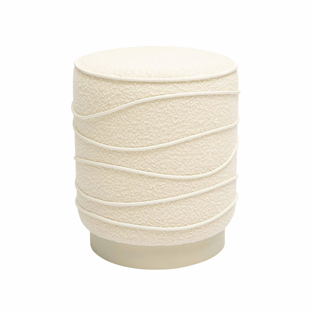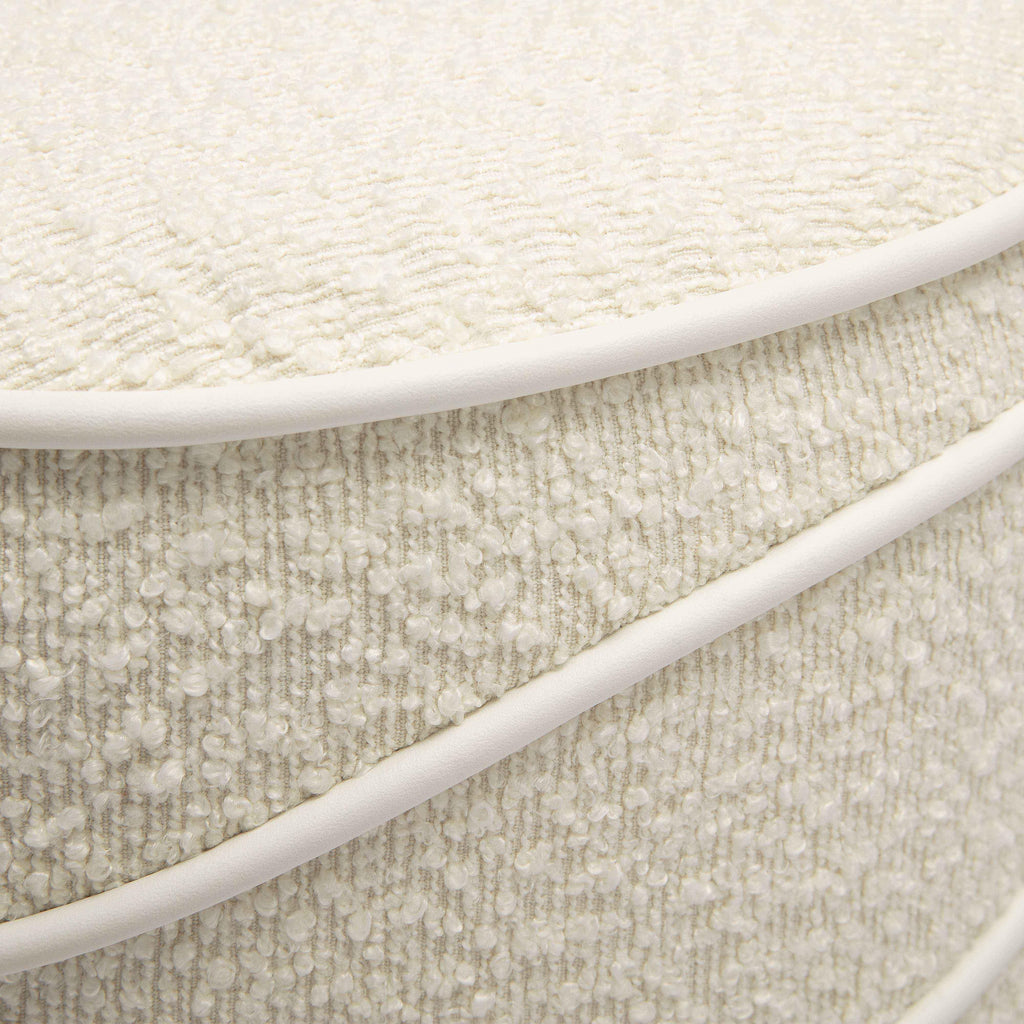 Love all things neutral? Meet the tone-on-tone Nero Boucle Ottoman, available in cream or grey. This textured masterpiece, resting on a sleek plinth base, serves as the ultimate accent piece for any neutral-toned space. Its captivating design is highlighted by continuous wavy lines, complemented with hand-stitched contrast piping, adding a touch of luxury and craftsmanship to any room.