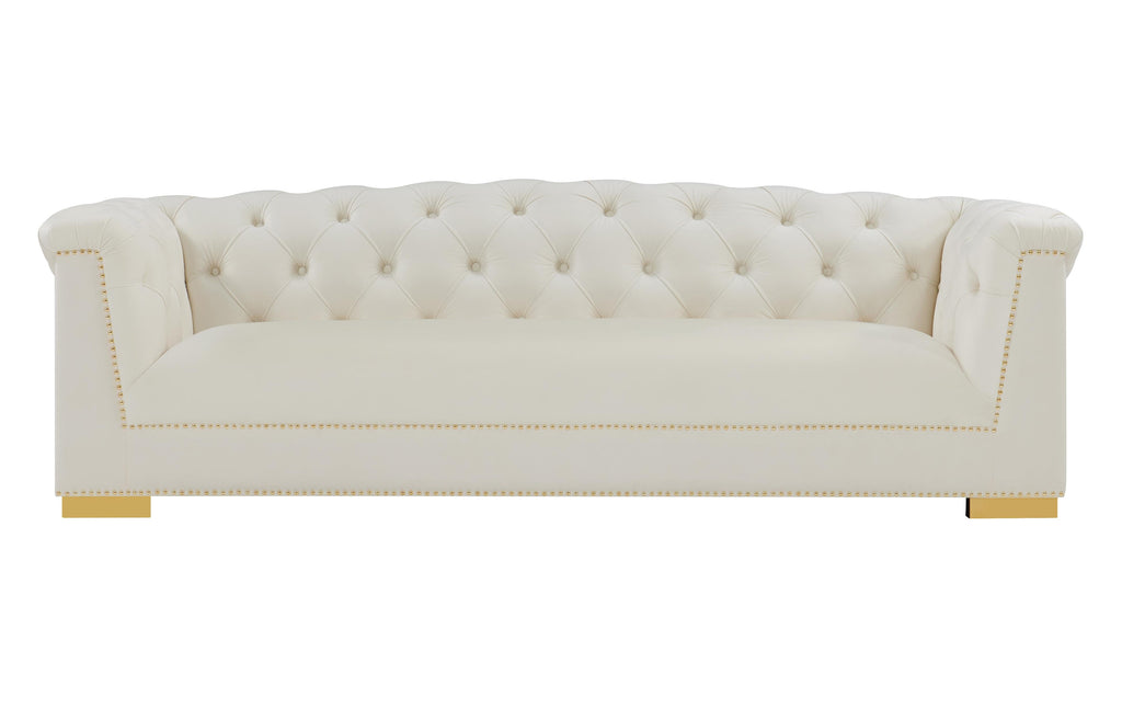 Offering a fresh and modern spin to a classic style, Inspire Me Home Decor and TOV proudly introduce the Farah sofa. With its luscious velvet upholstery, unique tufted design on its rolled arms and hand applied gold nailhead trim, it will be the focal point of your living space. Available in several neutral color options to meet your home styling needs.