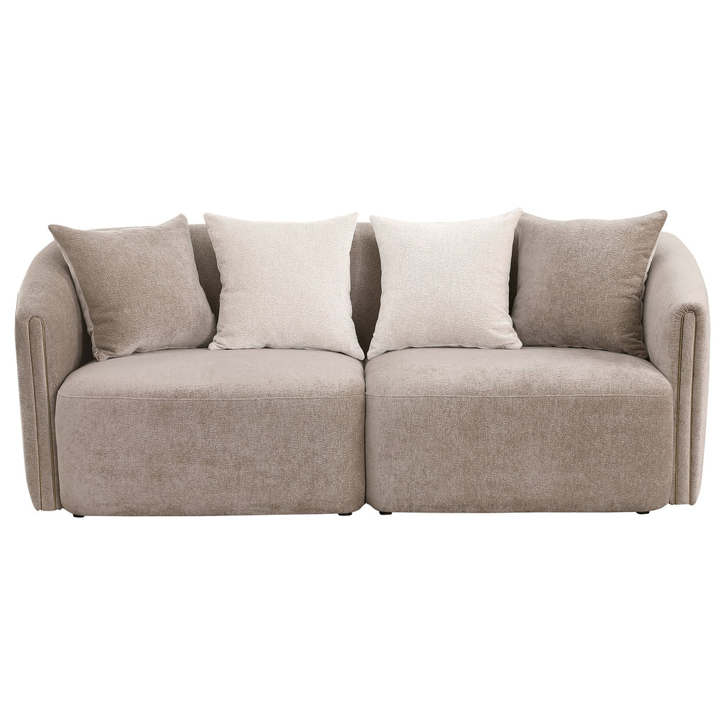 Bring fresh style and sophistication to your living room with a modern two-piece sofa set. An updated shelter silhouette defines each piece, with neutral latte chenille upholstery that adds warmth. Complementary accent pillows add softness to foam cushions, perfect for everything from entertaining to lounging. The sofa and loveseat are a charming pair, each with sloping arms with tailored details and slight recessing that allows seating to stand out. Choose this set for a refined but approachable look in your home.