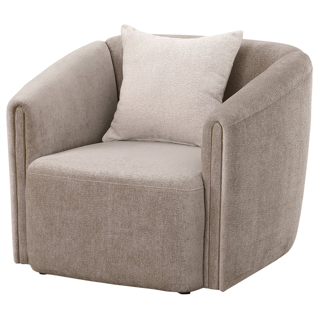 Thoughtful design highlights a modern armchair. Designed for comfort, it boasts sinuous springs and pocket coils paired with attached foam cushions for a sleek look. Its modernized shelter silhouette and sloping arms create an inviting ambiance, perfect in a living room or den. The armchair is complete with latte-colored chenille upholstery with a slight wavy pattern for a touch of texture and depth. A single accent pillow adds to a welcoming look with a feather blend fill.
