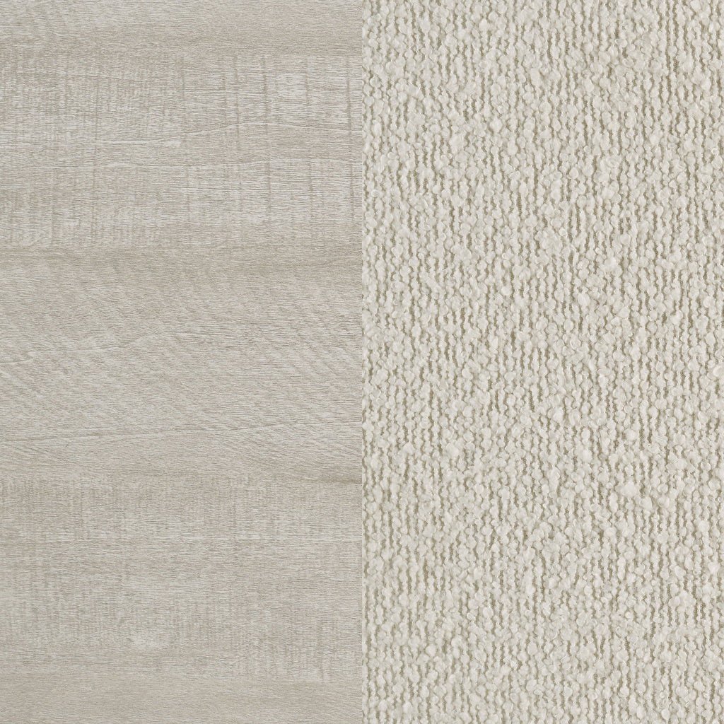 This contemporary bed is the perfect fusion of style and comfort, designed to bring a cool, modern vibe to any bedroom. With its unique "floating" effect, it creates a sense of spaciousness and sophistication. The headboard is upholstered in a soft, cream bouclé fabric, adding a touch of texture and warmth that complements the bed's rustic cream finish. Crafted from asian hardwood and engineered wood with a rough-sawn, white-washed engineered paper veneer, this bed showcases a Yin & Yang contrast between rustic and refined design elements.