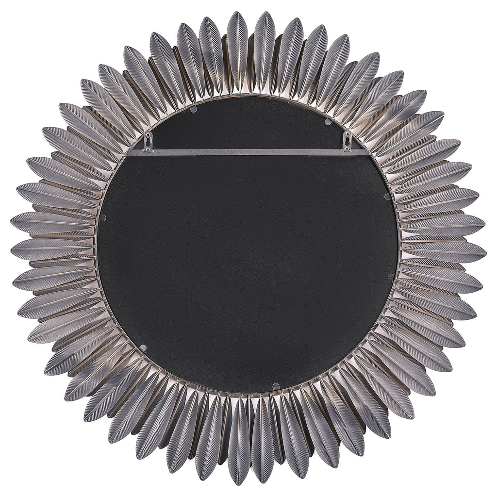 Instill the freshness of springtime in your living area or bedroom decor with a modern wall mirror. Offering sculptural presence, it boasts a center of round mirror glass. The frame is a double layer of delicate petals, introducing a floral element that creates cheerful energy in any setting. The mirror boasts a gold finish, evoking yellow daisies or bright sunflowers. Metal construction graces the frame, while MDF backing adds strength to 4mm thick mirror glass.
