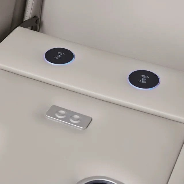 Smart Power Sofa: Drop-down table featuring wireless charging, electrical outlets, and LED lights.
