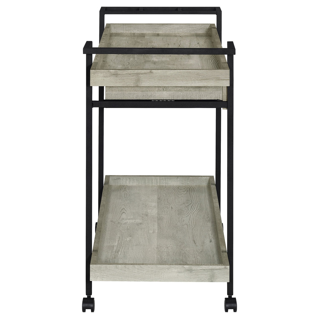 Speakeasy charm meets modern farmhouse in a delightful mobile bar cart. Whether you're mixing cocktails or pouring a favorite vintage, the cart offers plenty of space for both storage and prep with a tray-style top and shelf, plus a drawer ideal for accessories. A black finish metal frame includes handles, with three open squares on one side that help to keep bottles upright. A casual gray wood grain finish accents the look with farmhouse inspirations, perfect for relaxed living and dining rooms. Ball bearing drawer glides and caster wheels complete the cart with smooth, seamless performance.