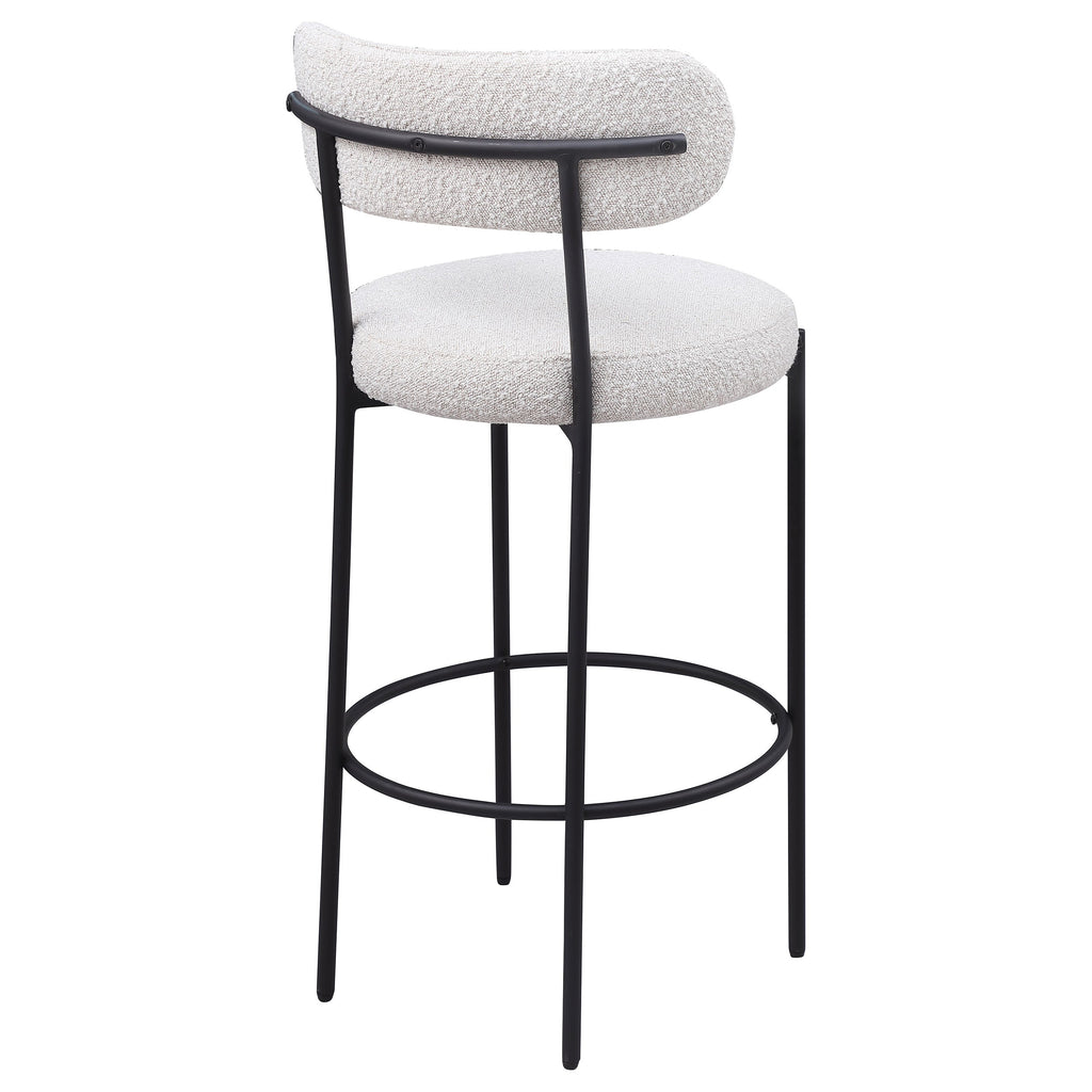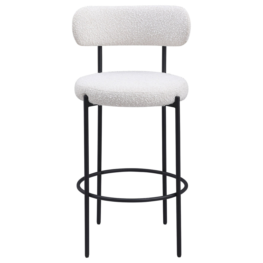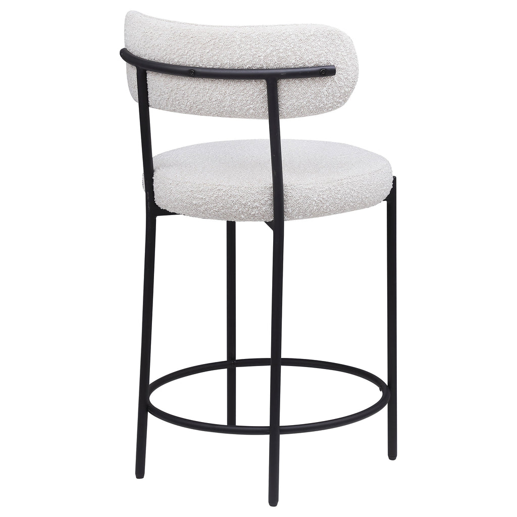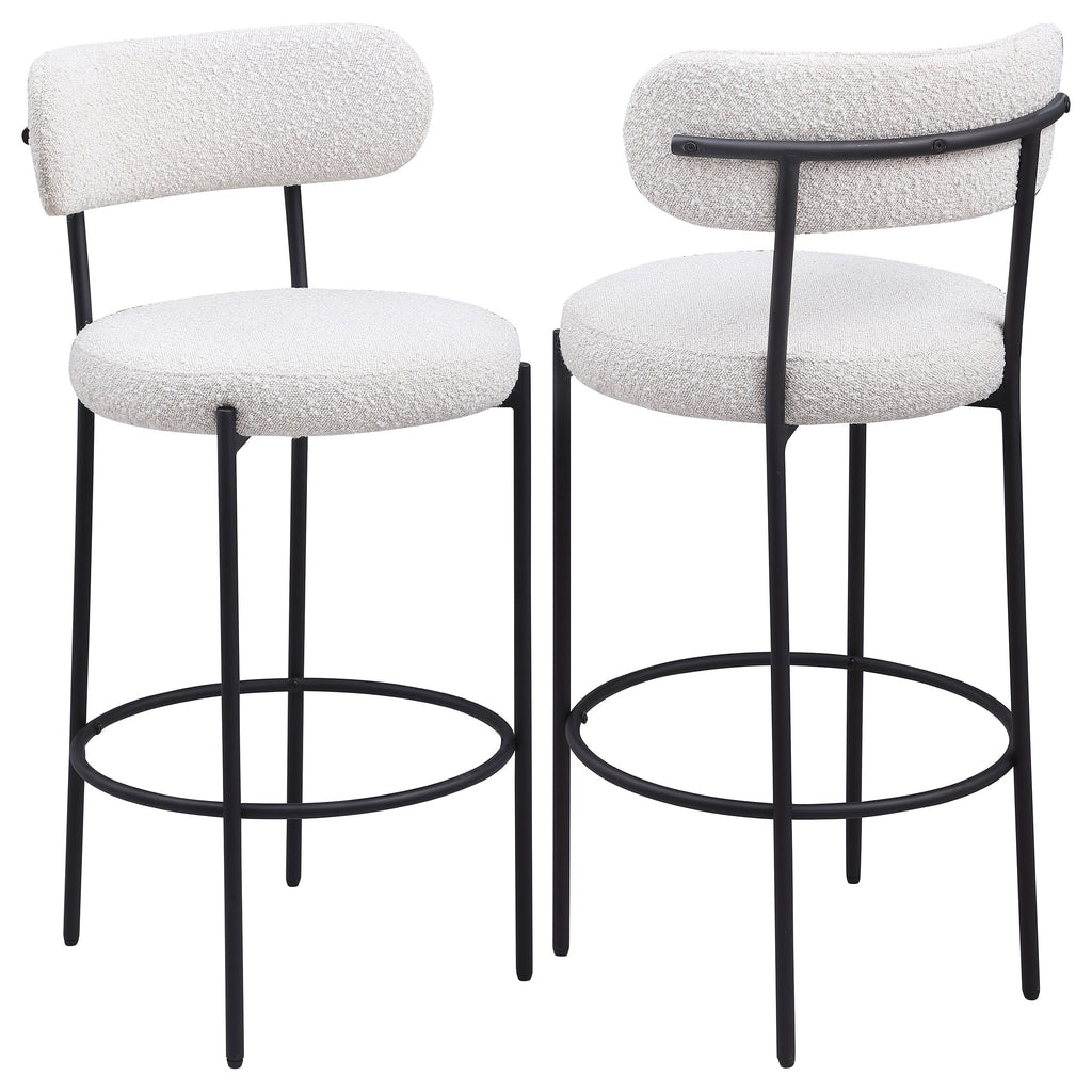 Your kitchen island or counter table gets an instant upgrade with this set of two modern barstools. The pair features contemporary boucle upholstery in a neutral hue over foam cushions for comfort. Metal framing features a black finish and provides excellent support and durability with slim legs and supports that create a sleeks silhouette. Each counter stool showcases round seats and curved backrests for excellent comfort and support while enjoying a meal or catching up with the family. Finally, a ring footrest provides plenty of support and a charming touch of character.
