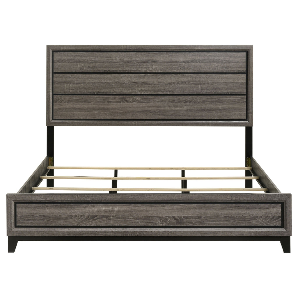 Bring a transitional California king bed into your sleeping space for exceptional style. The large single panel headboard is equipped with horizontal grooves for depth and dimension. The black and grey oak finish of this bed makes it an excellent option for all styles of bedrooms. With a low profile footboard and framed groove design, there is no shortage of style with this piece. Place it in your bedroom to create a warm and stylish appearance.