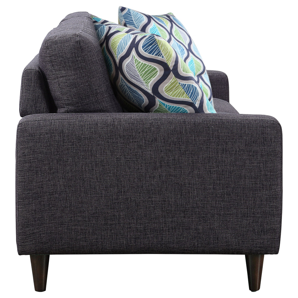 Relax on this stationary sofa that has clean lines and style that's sure to satisfy. Seat cushions are plush for hours of enjoyment watching anything from Netflix to the playoffs. Thick, button-tufted seat backs add timeless style as well as comfort and support. Round tapered legs and wide arm supports impart sturdiness and convenience all in one. Wrapped in dark grey fabric that appeals to even the most discerning homeowner.