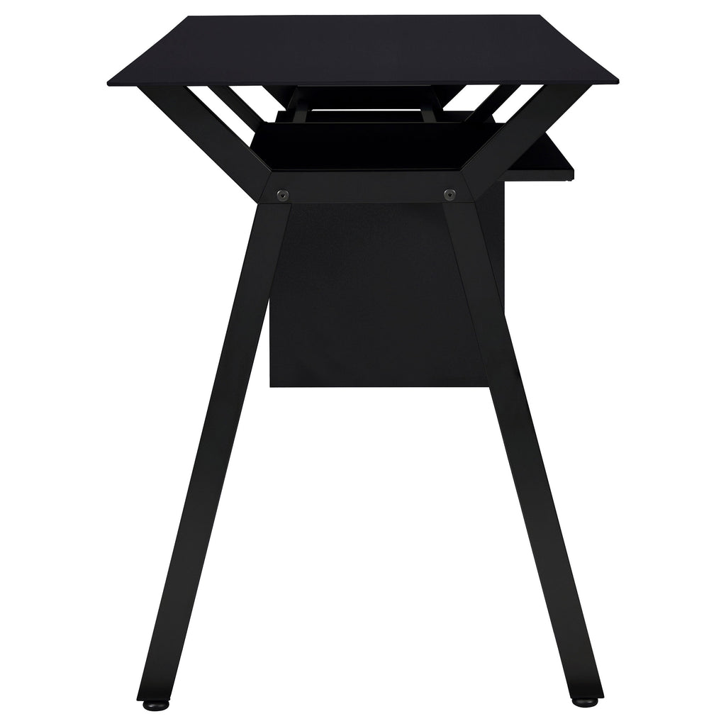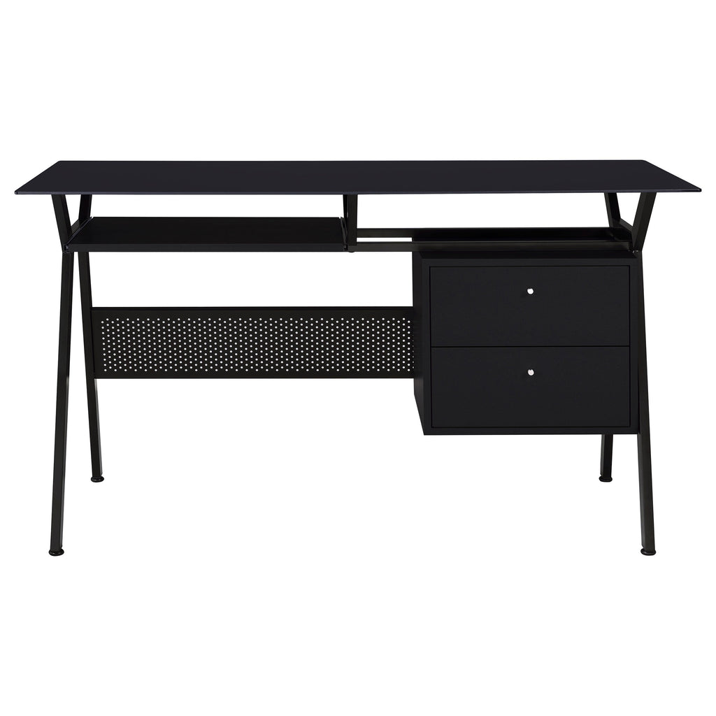 The sleek design of this computer desk adds a touch of taste and class to any workspace. Four supportive legs are elegantly curved to create an elegant silhouette. A black finish and black tempered glass top give it a pleasing, monochromatic look. Its three convenient drawers include a keyboard drawer with Euro glides. This desk is constructed from steel and other high-quality materials for strength and durability.