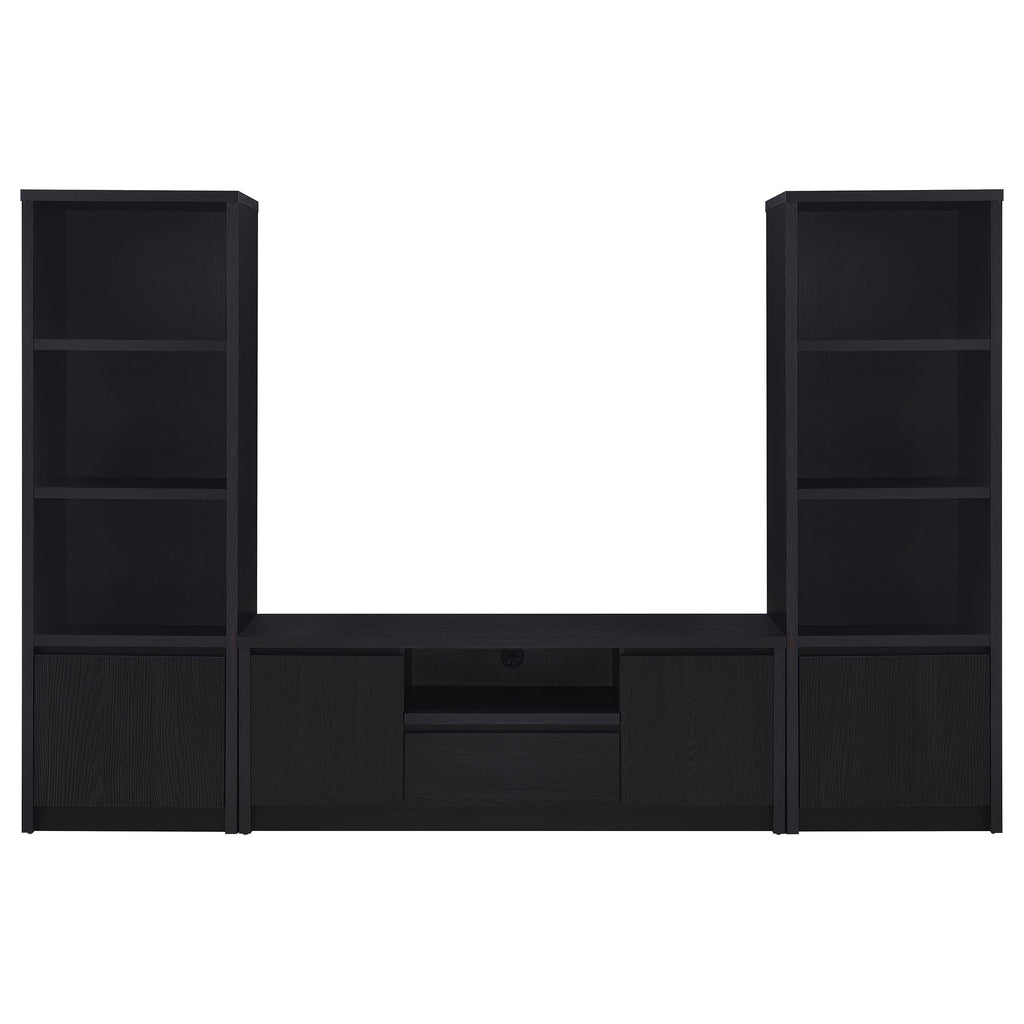 This modern entertainment center combines a sleek TV stand with two matching media towers, offering style and functionality. Finished in a bold black with a scratch-resistant eco-friendly laminate veneer, this unit provides ample storage and display options. The TV stand features cabinets, an open shelf with cable management, and a wide drawer, while each media tower includes open shelves and a bottom cabinet for organized storage. Perfect for creating a cohesive entertainment space in any living room.