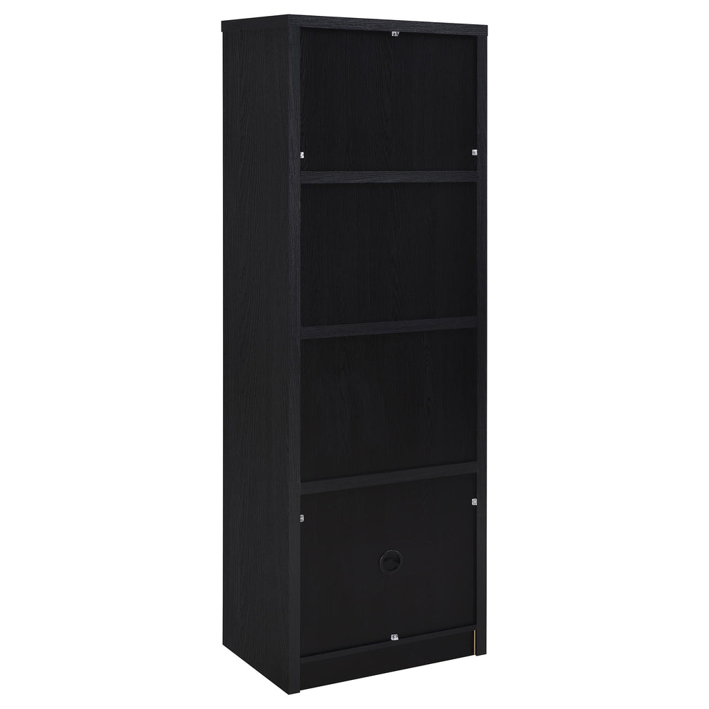 This contemporary media tower combines functionality and modern design in a sleek black finish. Built from durable engineered wood with a scratch-resistant laminate veneer, it features three open shelves for organizing media devices, books, or decor. A bottom cabinet offers concealed storage to keep clutter at bay. Its tall, clean-lined silhouette provides vertical storage, perfect for maximizing space in living rooms, home offices, or entertainment areas.