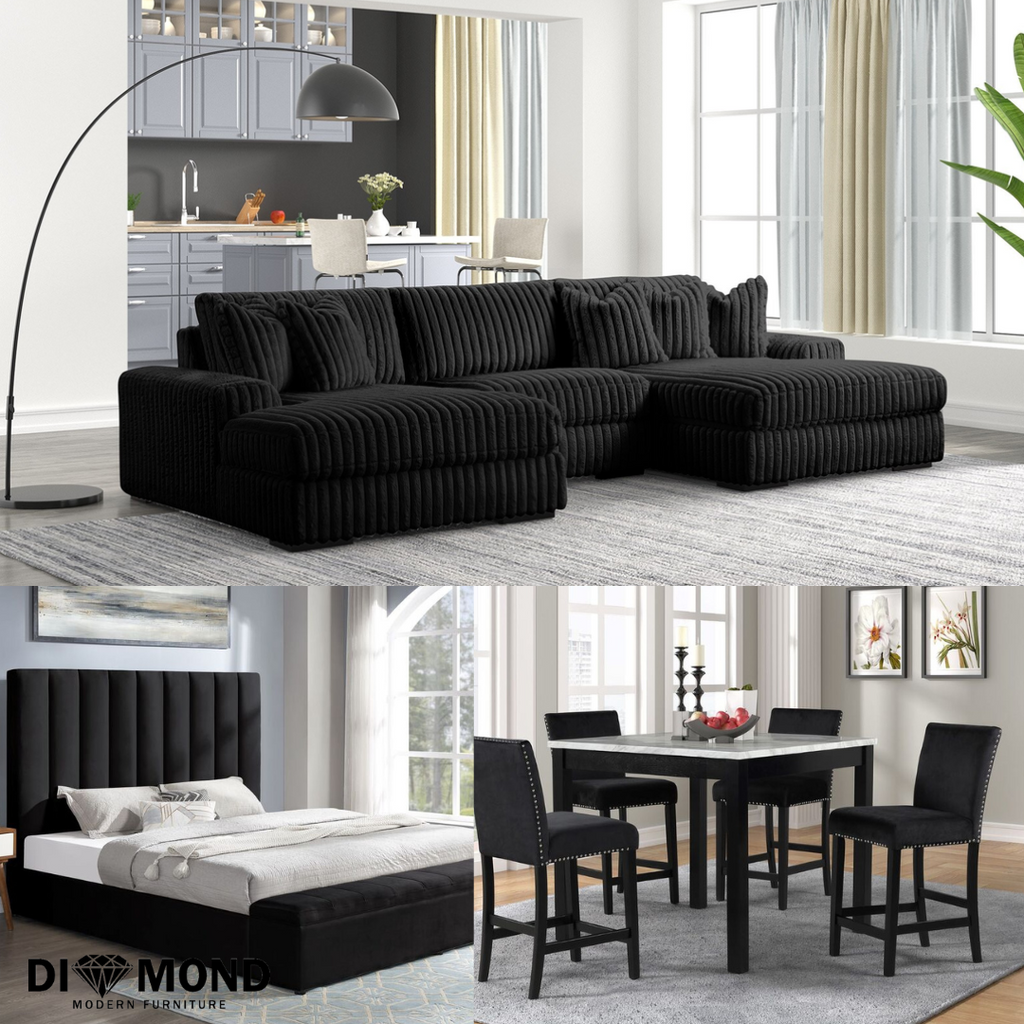 Explore our XL Sunday 3-room package, which includes a 3-piece sectional sofa, 5-piece dining set, and queen-size bed. Upgrade to a king size for just $199.99 more to create the ultimate living space.