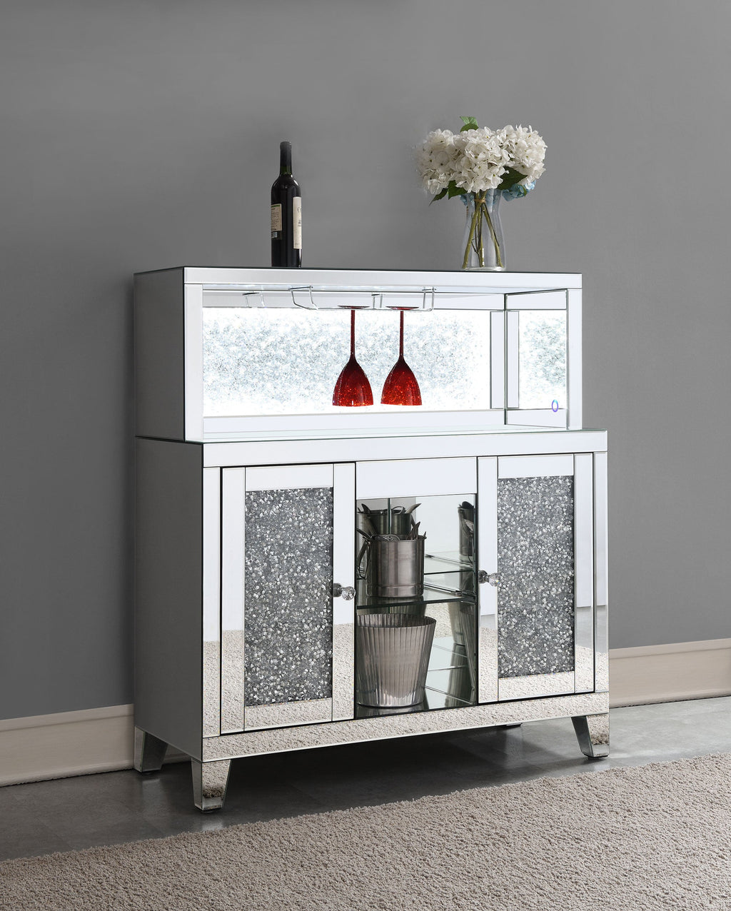This wine cabinet features a highly reflective surface made of mirror tiles and trim