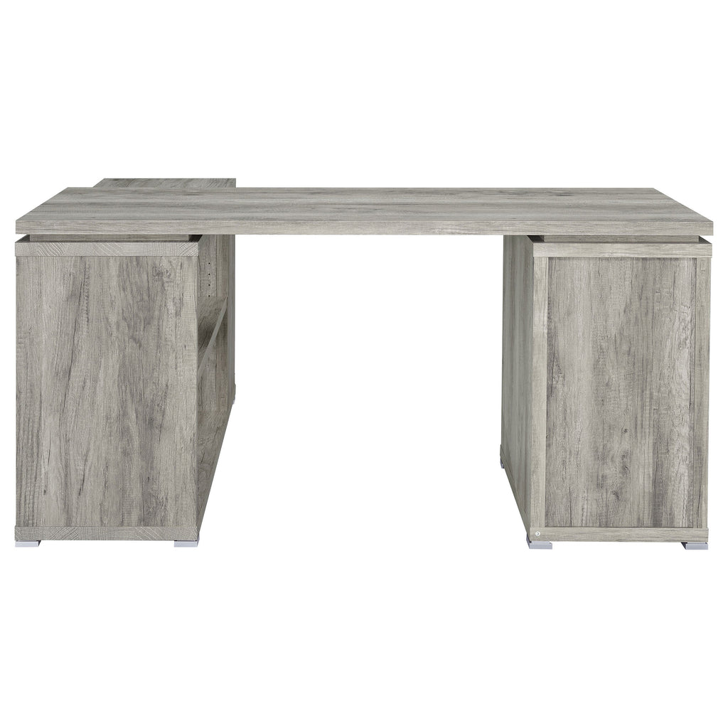With a subtle touch of style, this L-shaped office desk is an excellent choice for a home office. With open shelves on one end and three drawers on the other, it allows ample storage space to keep yourself organized. Its file cabinet accommodates legal sized files for added versatility. An understated finish of weathered grey gives it a hint of glamour. MDF, particle board, and engineered veneer construction offers maximum durability to complete its sensible appeal.